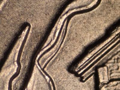 Reverse: Light die scratch near the corn stalk to the left of the roof. Die gouge at the center of the area below the homestead and to the left of the water pump.