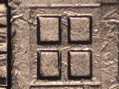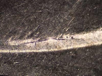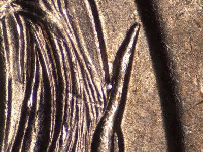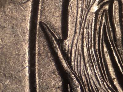 Reverse: Pre-die break depression on the left tip of the roof. Die chips in similar locations on both corn stalks. Die gouge northeast of the bucket.