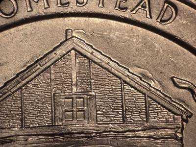 Reverse: Many pre-die break depressions on the roof. Die chip on the lower right corn stalk. Die scratch through part of the left corn stalk.