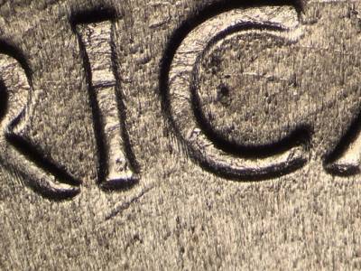 Obverse: Die gouge far below the T in LIBERTY. Old die scratch through the IC in AMERICA.