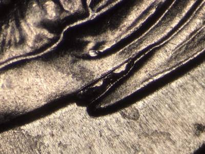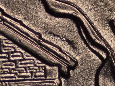 Reverse: Pre-die break depression on the right side of the roof and below the bucket. Small die chips near the bottom of both corn stalks. Die gouge between the bucket and the water pump.