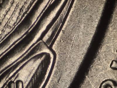 Obverse: Die gouge to the left of the E in WE. Die gouges inside and below the E in STATES.
