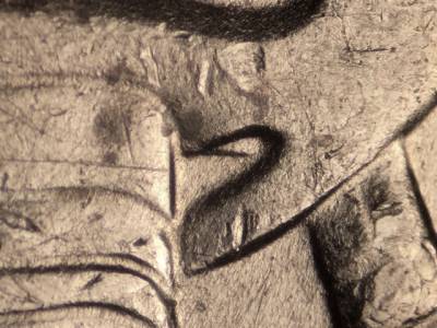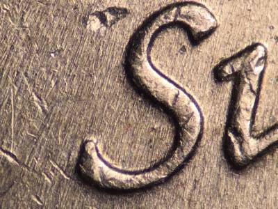 Reverse: Die gouge inside the lower part of the S in SURRENDER.