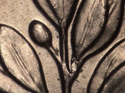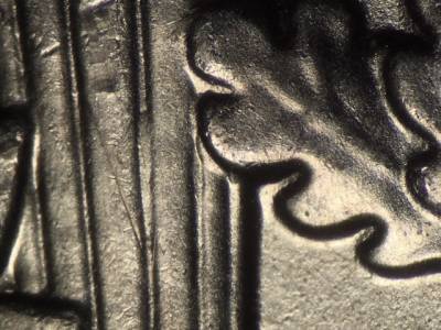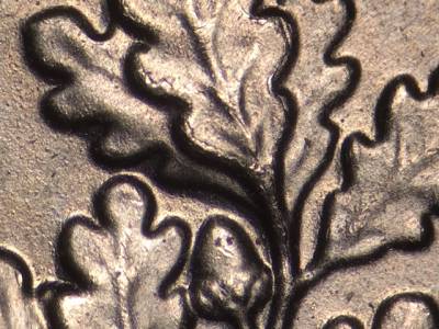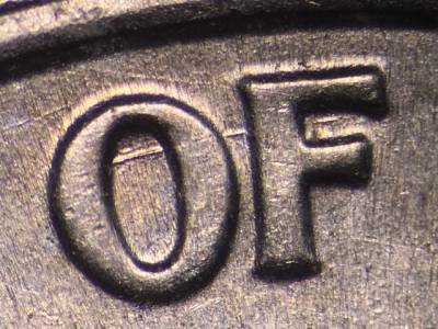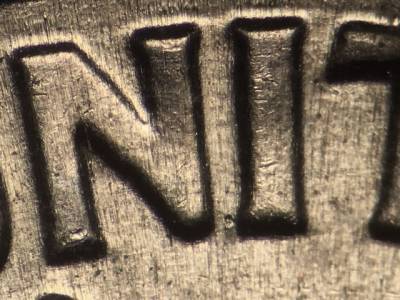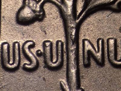 Reverse: Stage A: Many die cracks and chips on the bottom and the top of the torch. Strong die scratch through OF. Die gouge to the left of the first S in STATES. Die gouge between the bottom of the N and I in UNITED. Stage B: Stage A markers still present. New die chips on the olive and oak branches, the L in PLURIBUS, and the first U in UNUM.