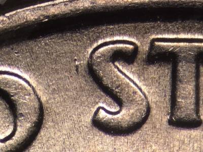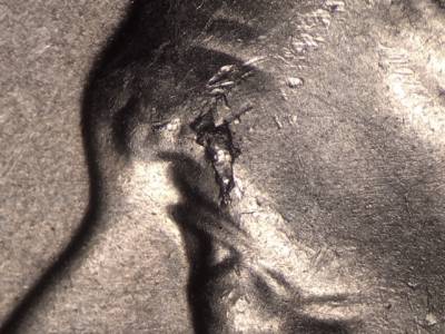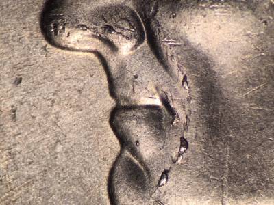 Obverse: Stage A: Many die cracks and chips on the chin, the back of the lips, the cheek, the nose, the eyebrow, and the hair. Stage B: Stage A markers still present. New strong die gouge above the T in LIBERTY.