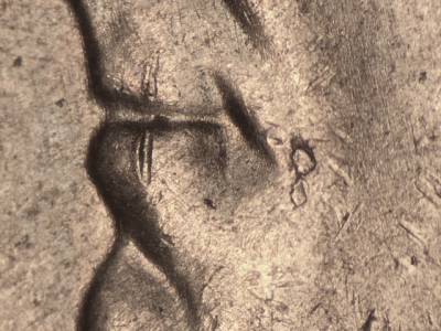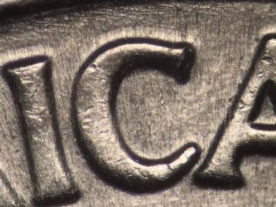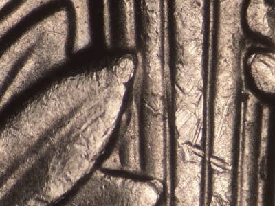 Obverse: Die chips on the back of the lips. Die gouge inside the mintmark.