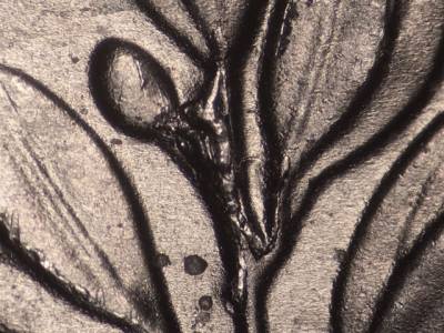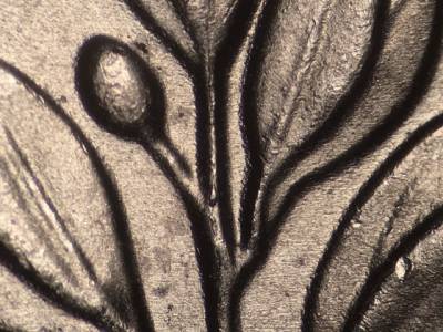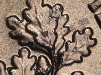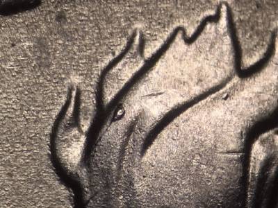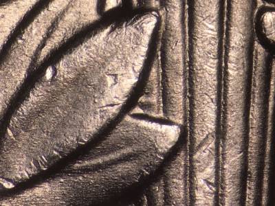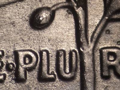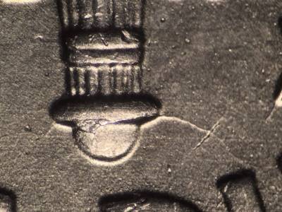 Reverse: Stage A: Many die cracks and chips on the bottom of the torch, the flame, the olive and oak branches, and the first U in PLURIBUS. Die gouge on the upper right of the M in DIME. Die gouge to the left of the O in OF. Old die scratches through UNITED. Stage B: Stage A markers still present. Die cracks and chips have increased in size.