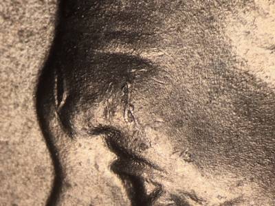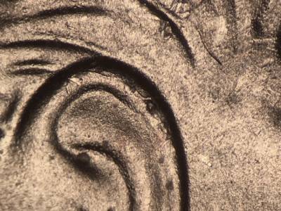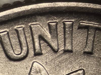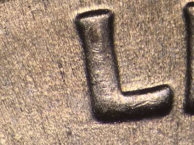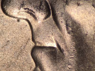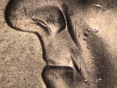 Obverse: Stage A: Die chips on the back of the lips, the nose, and the ear. Die gouge to the left of the L in LIBERTY. Die gouge near the rim below the E in WE. Stage B: Stage A markers still present. Die cracks and chips have increased in size. New die chips on the eyebrow.