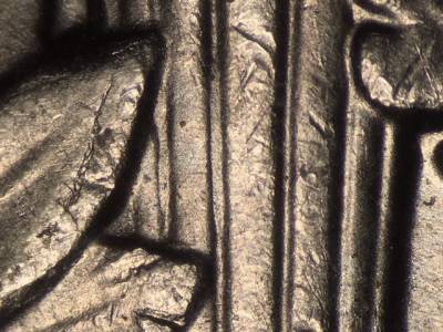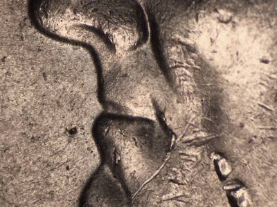 Obverse: Die chips on the lower lip, the back of the lips, the nose, the eyebrow, and in the hair.