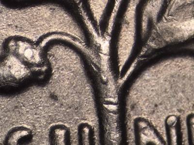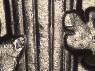 Reverse: Die cracks and chips on the bottom of the torch and in the lower oak branch. Two die gouges inside the first A in AMERICA.