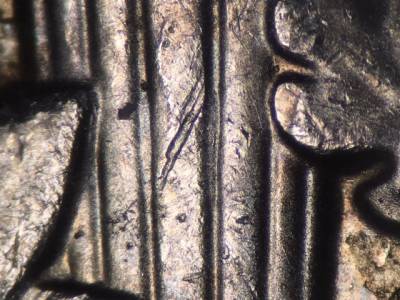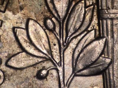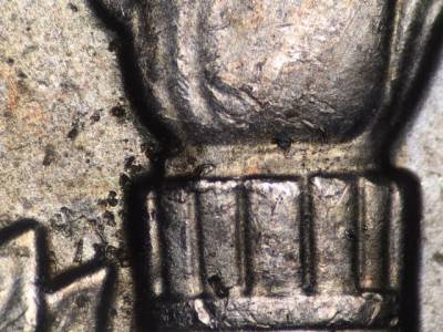 Slight doubling in the fluting to the right of the olive leaves overlapping the torch. Very similar to SDDR-012, compare doubling and die markers.
