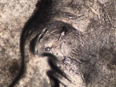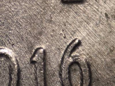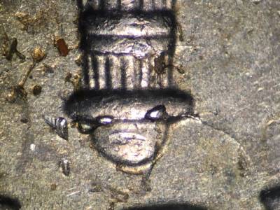 Obverse: Die cracks and chips on the back of the lips, the nose, the eyebrow, in the hair, and on the ear. Multiple die gouges above and to the left of the 6 in the date.