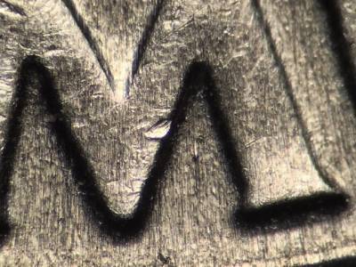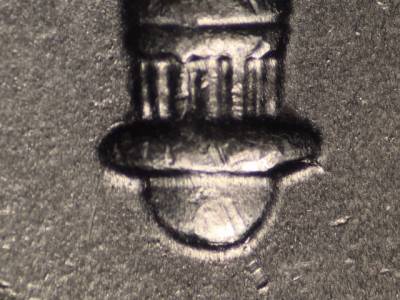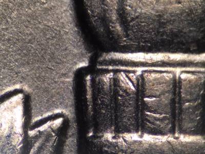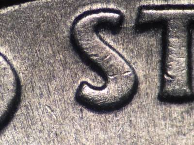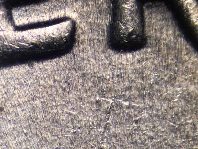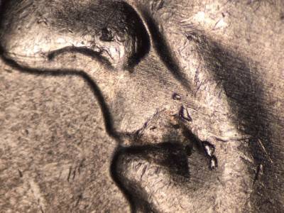 Obverse: Die cracks and chips on the back of the lips and the nose. Multiple small die gouges below the left side of the R in LIBERTY.