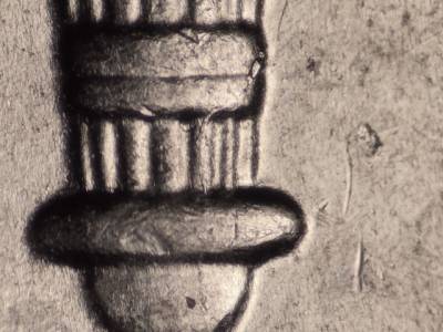 Slight doubling in the fluting to the right of the olive leaves overlapping the torch.