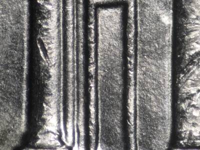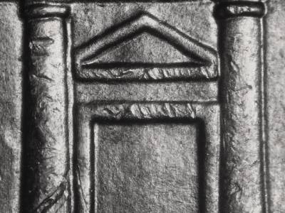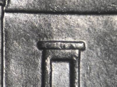 Reverse: Small die gouge above the tall right window. Small die gouge inside the window between the two left columns.