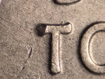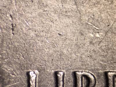 Obverse: Die chip between the J and F in the designers initials JF. Die gouge far above the I in LIBERTY.