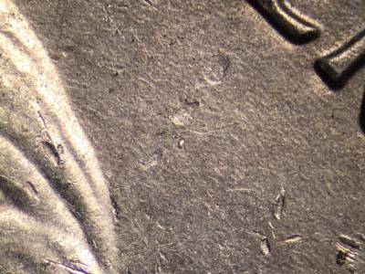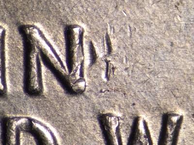 Obverse: Stage A: Die gouge above the left side of the W in WE to the right of IN. Many long die gouges above the two Ls in DOLLAR. Die gouge between the back of the head and the ER in AMERICA. Stage B: WDDR-003. It is not known whether die gouges around the Ls or the one behind the head is still present. Die gouge near IN still present. New die gouge in the left side of the M in AMERICA.