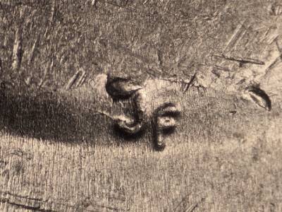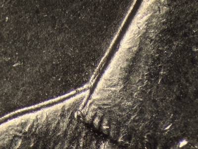 Reverse: Curved die gouge where the two mountains in the background meet.