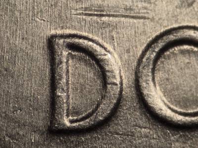 Obverse: Die chip above the J in the designers initials JF. Die gouge above the right side of the D in GOD.
