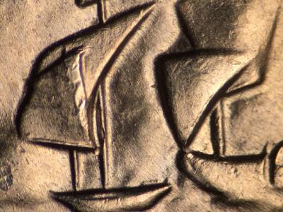 Reverse: Stage A: Thin die crack on the upper arm. Stage B: Die crack on the upper arm developed more die chips. Nearly a retained interior die break in the area between the shoulder and the flagpole. Small die cracks along the sails of both of the ships in the background. Stage C: More die chips developed on the upper arm. Die break formed in the area between the shoulder and the flagpole. Die breaks formed on the ships in the background.