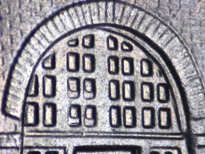 Reverse: Die gouge in the bottom of the lower central doorway.