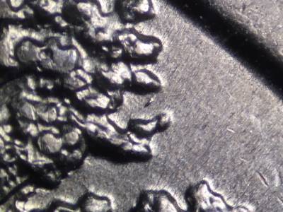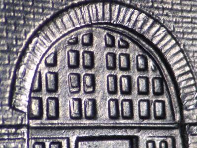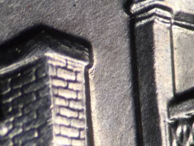 Reverse: Stage A: Die gouge above the building. Stage B: Stage A marker still present. Die gouge in the branches of the right tree.