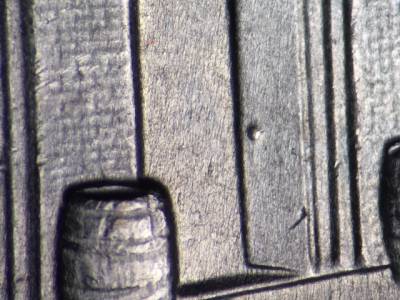 Reverse: Two die gouges in the second doorway. Die gouges in the lower right window to the right of the first doorway.