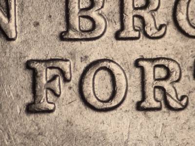 Light extra thickness on JOHN BROWN'S FORT (most noticeable on the serifs), window panes, and bricks. Very similar to SDDR-057, compare doubling and die markers.