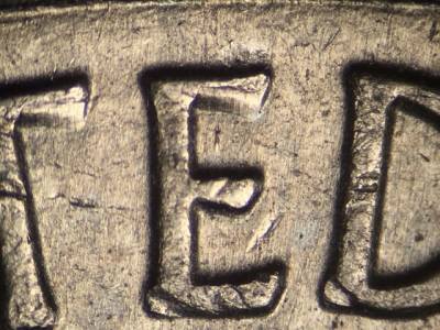 Obverse: Die gouge in the upper portion of the E in UNITED.