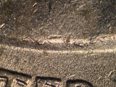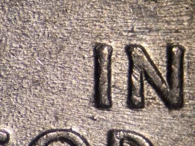 Obverse: Many die chips along the bottom of the bust. Die gouge below the I in IN.
