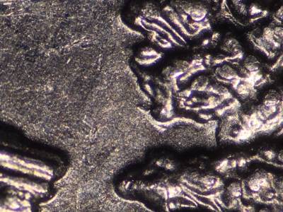 Reverse: Unusually shaped die gouge through one of the branches near the tower below FERRY.