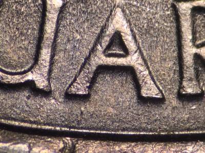Obverse: Die gouge between the left side of the A in QUARTER and the rim.