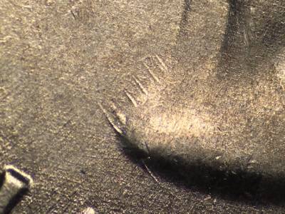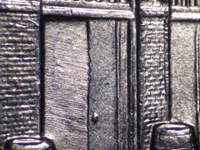 Reverse: Stage A: Heavy die damage throughout the reverse, mainly die scratches and gouges towards the center. Large die gouge takes up most of the fourth window in the first row. Stage B: Stage A markers still present. Die damage partially abraded away.