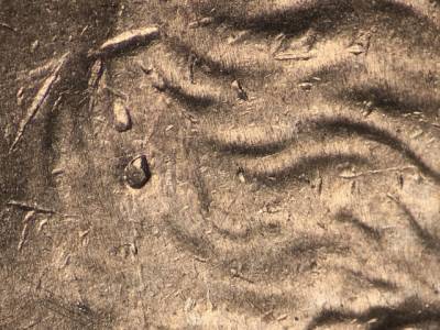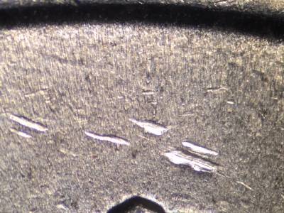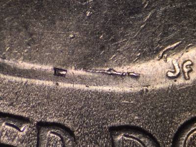 Obverse: A large die crack and a large die chip along the bottom of the bust above the R in QUARTER and the D in DOLLAR. Die gouge directly in the center of the head.