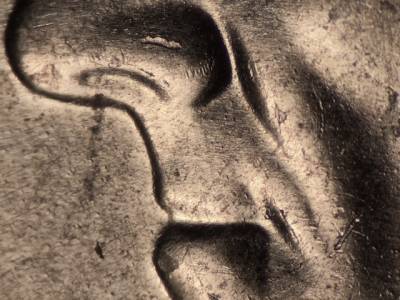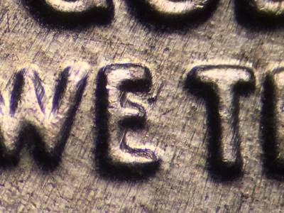 Obverse: Die chips on the back of the lips, the cheek, and the nose. Die gouge to the right of the E in WE.