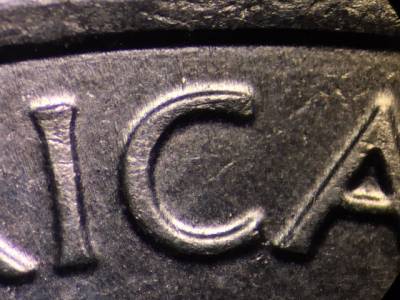 Obverse: Stage A: Die gouge touches the top of the C in AMERICA. Stage B: Same as Stage A.