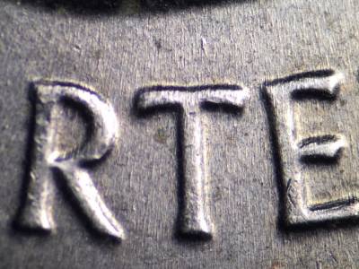 Reverse: Die gouge between the tree branch and the K in OZARK. Multiple pre-die break depressions in the tree branches below RIVERWAYS.