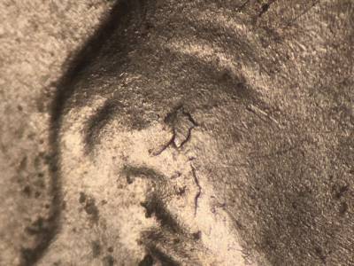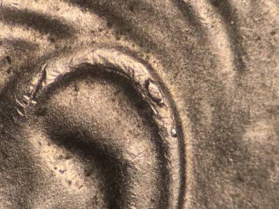 Obverse: Die chips on the the back of the lips, the eyebrow, and the ear.