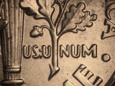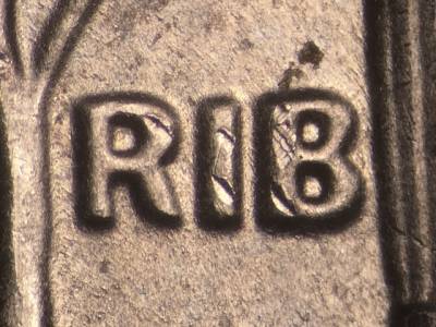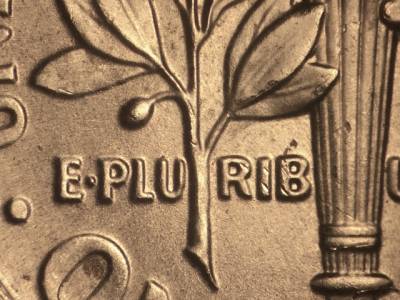 Doubling to the east on the middle olive leaf overlapping the torch and extra thickness on E PLURIBUS UNUM and the lower oak branches.
