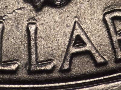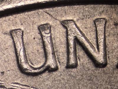 Obverse: Die chips to the left of the designers initials JF. Die gouge above the Q in QUARTER.