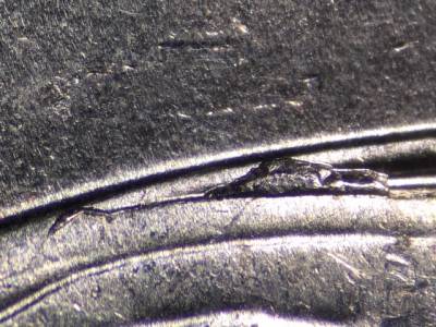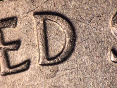 Obverse:  Long die scratch runs SW from the lower lip. Die gouge inside the lower right of the D in UNITED. Die gouge touches the bottom of the upper portion of the C in AMERICA.