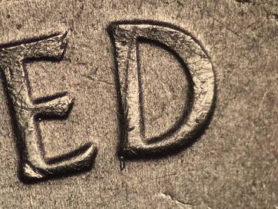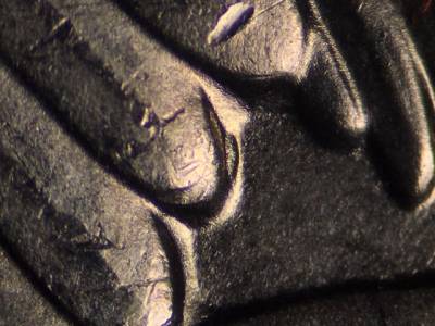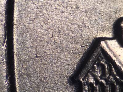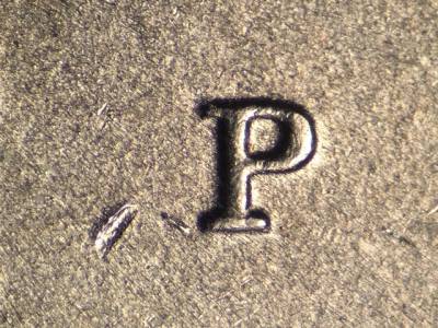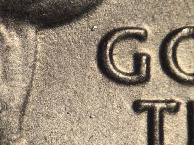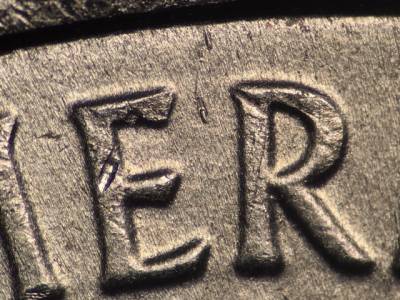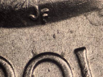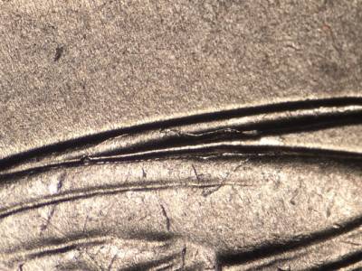 Obverse: Die gouge above the O in DOLLAR. Die gouge left of the mintmark P. Die gouge far to the left of the first T in TRUST. Die gouge above and to the left of the G in GOD. Die gouge between the tops of the E and R in AMERICA. Die gouge inside the upper portion of the first S in STATES. Die gouge touches the lower left of the D in UNITED.