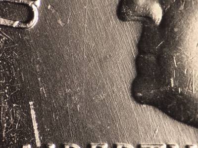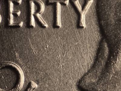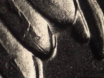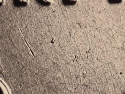 Obverse: Many strong die scratches throughout the obverse. Strong die gouges below the RT in LIBERTY. Die gouge on the bust to the right of the designers initials JF. Strong die gouge below the R in AMERICA.