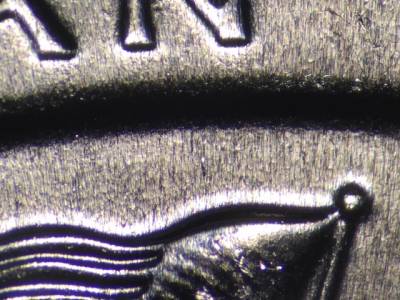 Reverse: Pre-die break depression above the Navy flag, later die states may have a die break in this location. NW-SE die gouge to the right of the trees on the far left. Die gouge between the N in AMERICAN and the American flag. Die gouge between the American and Army flag.