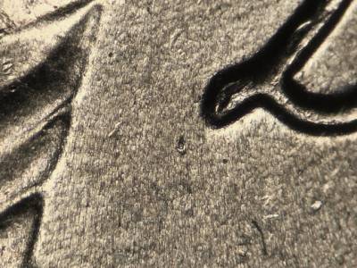 Obverse: Curved die gouge to the right of the nose. Die gouge far below the N in IN. Die gouge to the left of the first T in TRUST. Die gouge to the left of the bottom of the L in LIBERTY.
