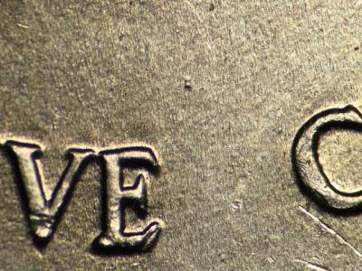 Reverse: Pre-die break depression on the left side of the building. Die gouge above the V in FIVE. Die gouge far northeast of the E in FIVE. Die gouge between the A and T in STATES. Multiple small die gouges between OF and CENTS.