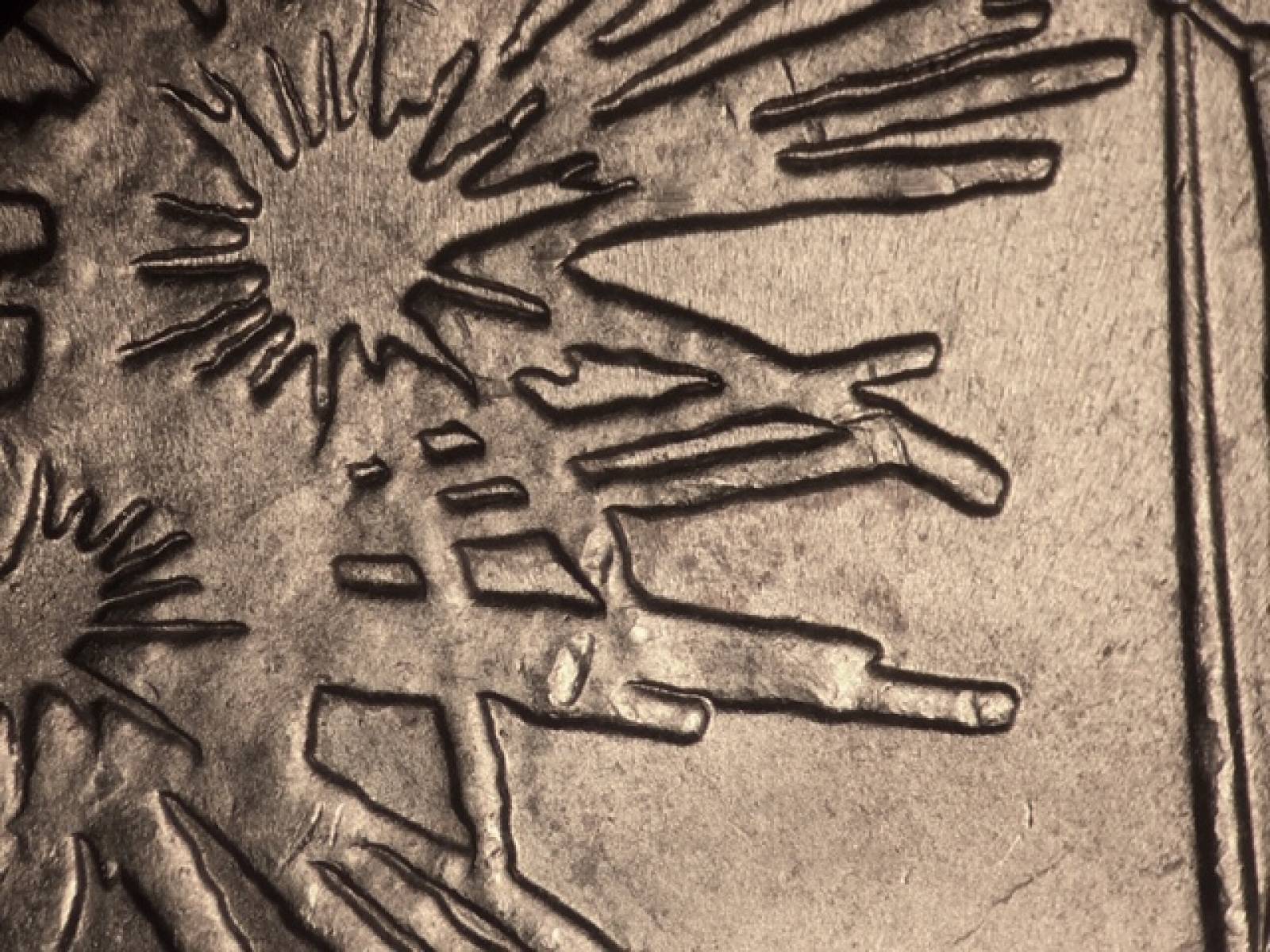 | SDDR-014 | Spread to the north on the doorway floor and part of the fort roof. Slight doubling on lower right firework bursts can be visible on Stage A. Cross-References: WDDR-009 Die Markers: Obverse: Stage A: Die scratch runs SW from the chin. Stage B: Stage A die scratch extremely weak and may not be visible. Die gouge in and above the O in DOLLAR. Two die gouges on the nose. Reverse: Stage A: None known. Stage B: Die gouges below the right side of the flag. | |