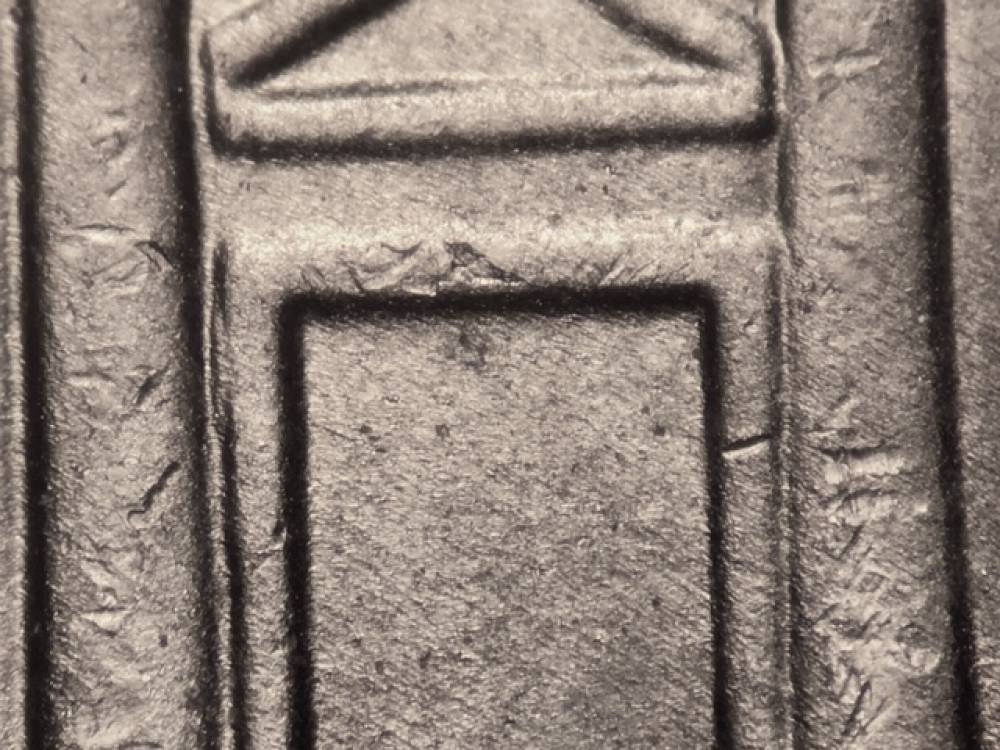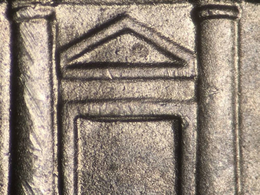 | SDDR-002 | Tripling in the doorway. The left side of the doorway is doubled to the east. Separate doubling of the doorway ceiling to the south. Die Markers: Obverse: Die gouge below IN. Die gouge nearly touches the bottom left of the R in TRUST. Reverse: Die gouge near the rim to the left of the building. Multiple die gouges between the T and E in UNITED. | |