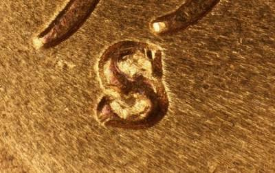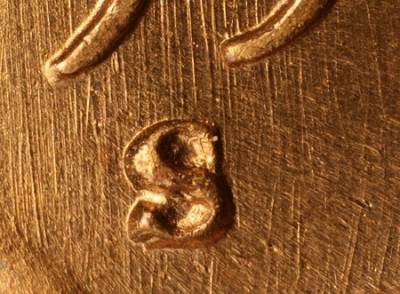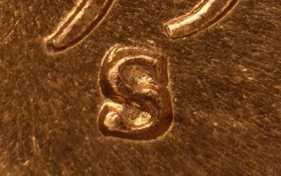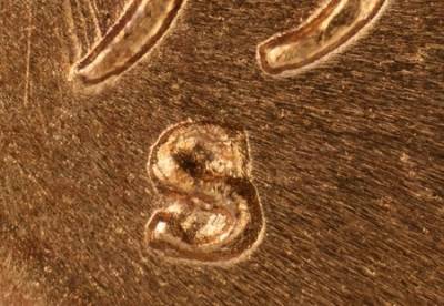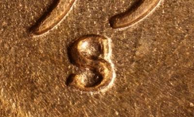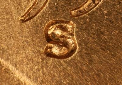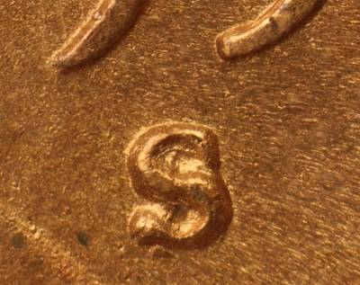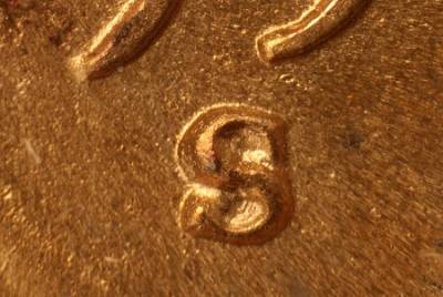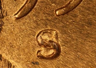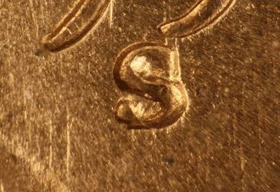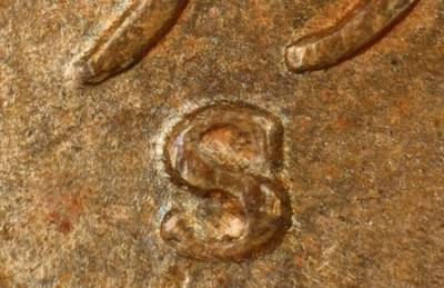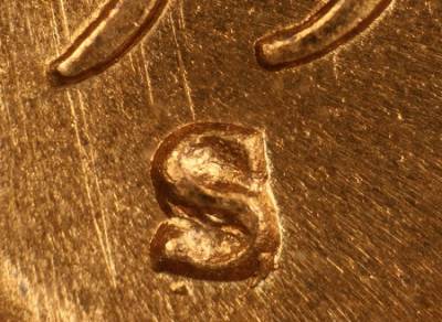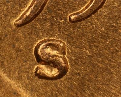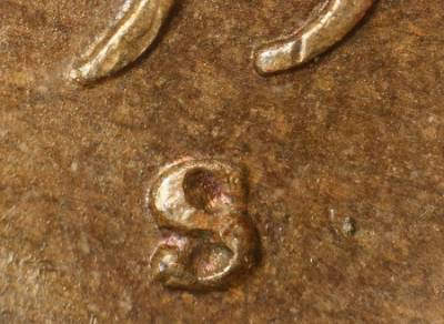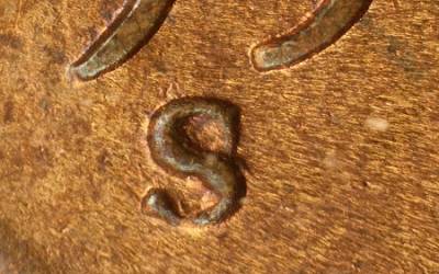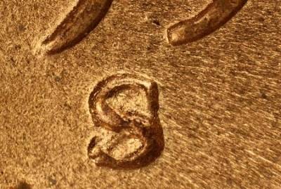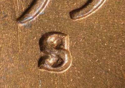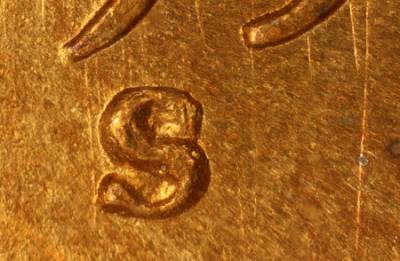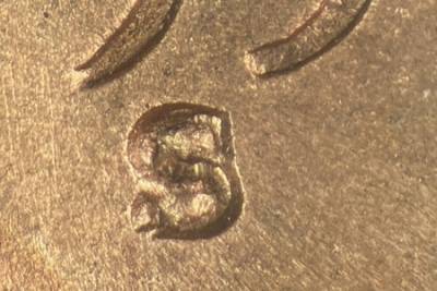 | WRPM-020 | S/S/S North and Tilted Comments: This die is similar to WRPM-004 but shows a secondary mintmark on the right side. Die Markers: Obverse: A short die scratch, oriented SSW-NNE shows SE from the lower O in GOD. A short die scratch runs N/S inside the lower opening of the ear. Reverse: Small die gouge (dot) under C in CENT. Die crack running north to south inside upper left wheat. | |