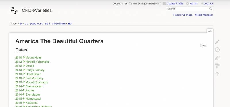======America The Beautiful Quarters====== =====Dates===== [[ATB2010POR|2010-P Mount Hood]] \\ [[ATB2012PHI|2012-P Hawai'i Volcanoes]] \\ [[ATB2012PAK|2012-P Denali]] \\ ...